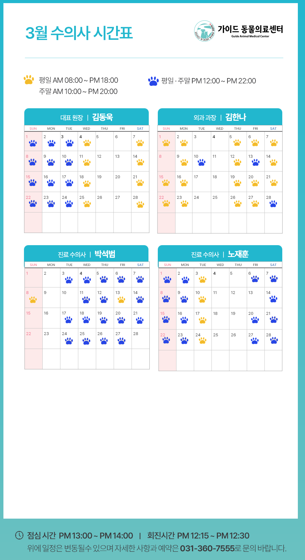 °¡ÀÌµå µ¿¹°ÀÇ·á¼¾ÅÍ2026³â 3¿ù ¼öÀÇ»ç Áø·á ½Ã°£Ç¥ ÀÔ´Ï´Ù.ÀÇ·áÁø º° ±Ù¹« ÀÏÁ¤ÀÌ ´Ù¸£´Ï, ³»¿øÇϽñâ Àü¿¡ Âü°íÇÏ½Ã¸é ´õ ¿øÈ°ÇÑ Áø·á°¡ °¡´ÉÇÕ´Ï´Ù.**º´¿ø »çÁ¤¿¡ µû¶ó ÀÏÁ¤ÀÌ º¯°æµÉ ¼ö ÀÖÀ¸´Ï, ¹Ì¸® ¾çÇØ ºÎŹ ..