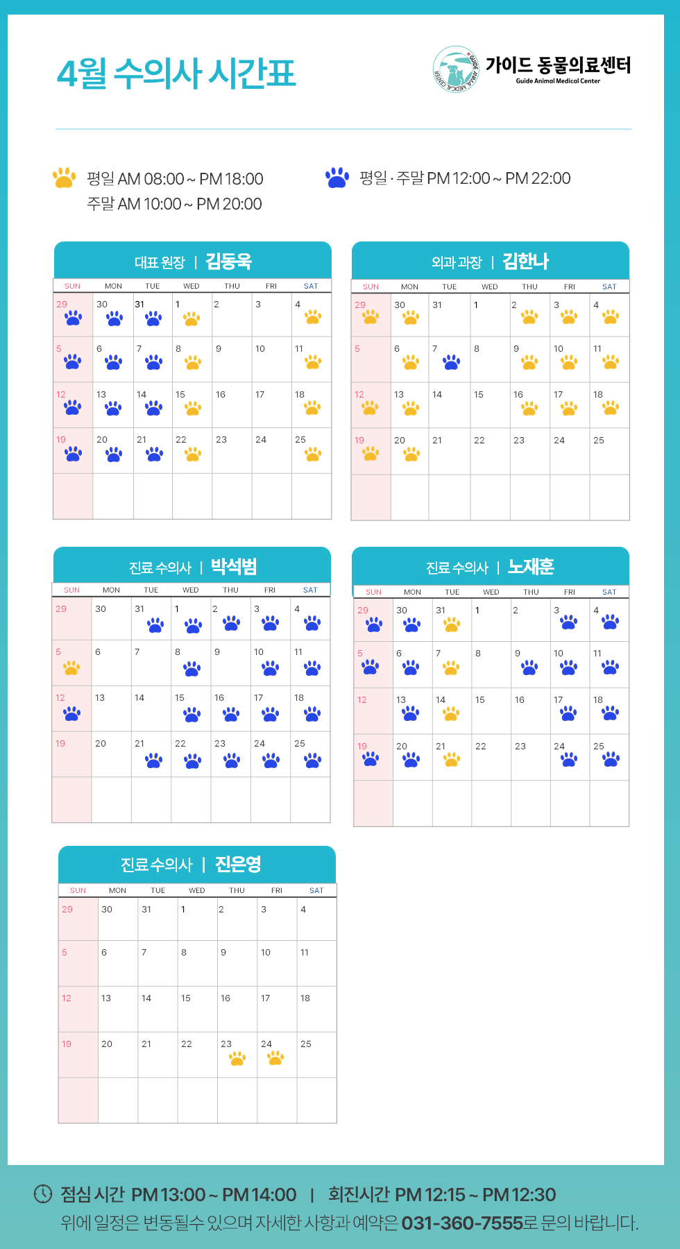 °¡ÀÌµå µ¿¹°ÀÇ·á¼¾ÅÍ2026³â 4¿ù ¼öÀÇ»ç Áø·á ½Ã°£Ç¥ ÀÔ´Ï´Ù.ÀÇ·áÁø º° ±Ù¹« ÀÏÁ¤ÀÌ ´Ù¸£´Ï, ³»¿øÇϽñâ Àü¿¡ Âü°íÇÏ½Ã¸é ´õ ¿øÈ°ÇÑ Áø·á°¡ °¡´ÉÇÕ´Ï´Ù.**º´¿ø »çÁ¤¿¡ µû¶ó ÀÏÁ¤ÀÌ º¯°æµÉ ¼ö ÀÖÀ¸´Ï, ¹Ì¸® ¾çÇØ ºÎŹ ..