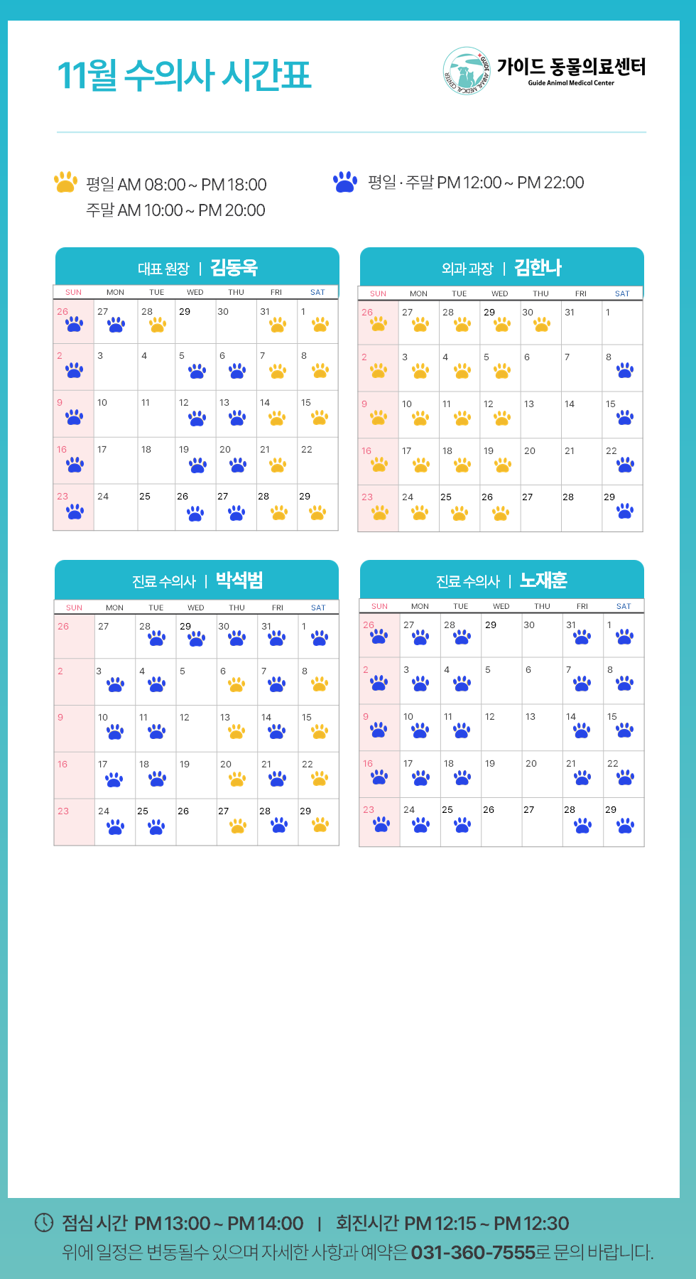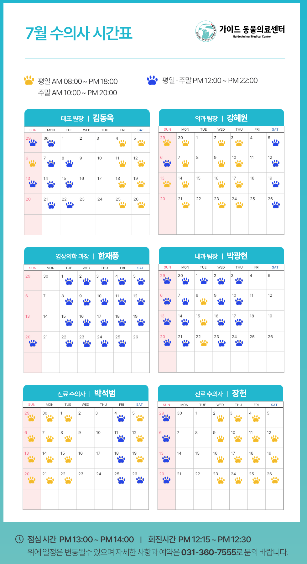 °¡ÀÌµå µ¿¹°ÀÇ·á¼¾ÅÍ2025³â 7¿ù ¼öÀÇ»ç Áø·á ½Ã°£Ç¥ ÀÔ´Ï´Ù.ÀÇ·áÁø º° ±Ù¹« ÀÏÁ¤ÀÌ ´Ù¸£´Ï, ³»¿øÇϽñâ Àü¿¡ Âü°íÇÏ½Ã¸é ´õ ¿øÈ°ÇÑ Áø·á°¡ °¡´ÉÇÕ´Ï´Ù.**º´¿ø »çÁ¤¿¡ µû¶ó ÀÏÁ¤ÀÌ º¯°æµÉ ¼ö ÀÖÀ¸´Ï, ¹Ì¸® ¾çÇØ ºÎŹ ..