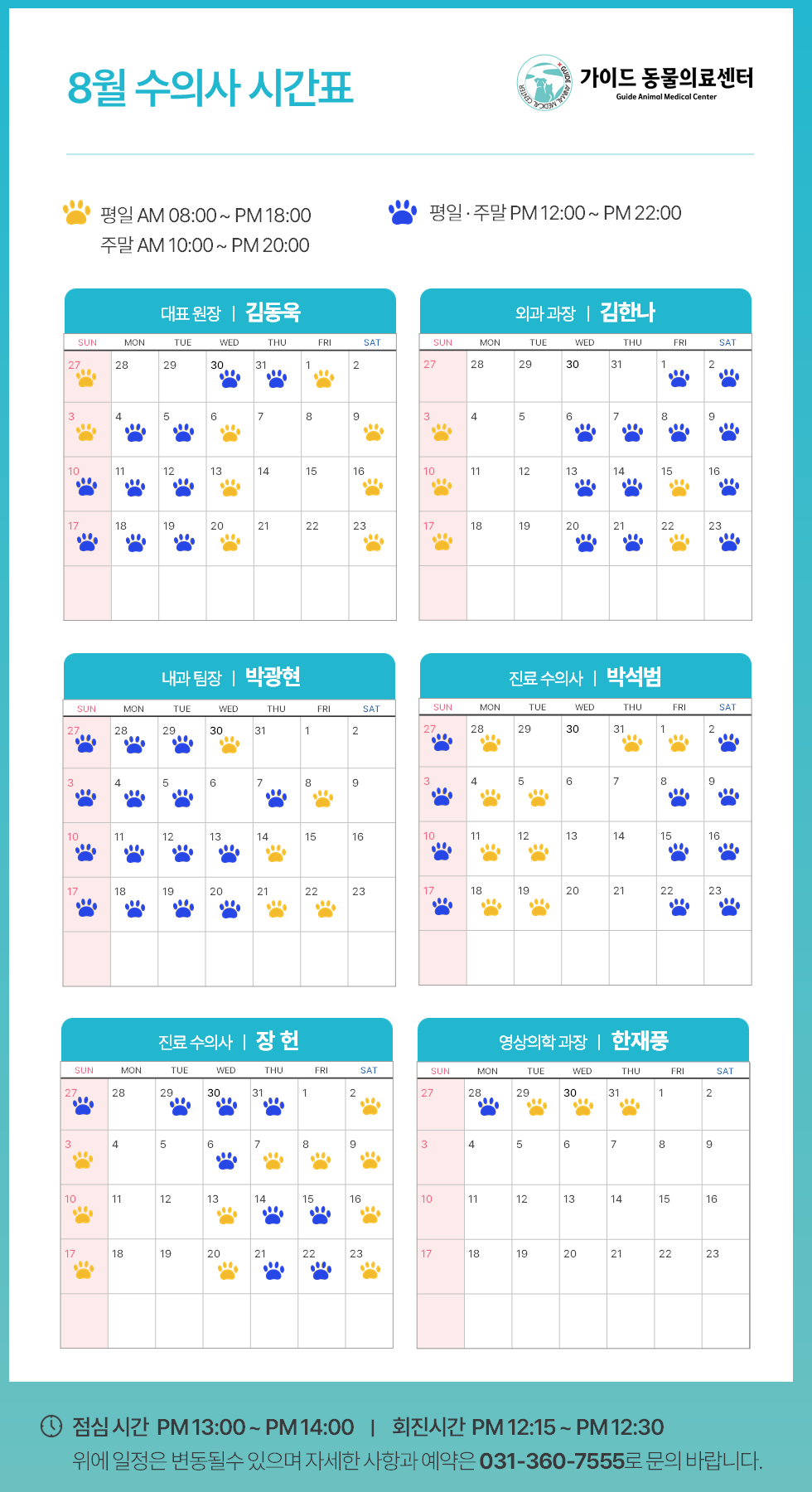 °¡ÀÌµå µ¿¹°ÀÇ·á¼¾ÅÍ2025³â 8¿ù ¼öÀÇ»ç Áø·á ½Ã°£Ç¥ ÀÔ´Ï´Ù.ÀÇ·áÁø º° ±Ù¹« ÀÏÁ¤ÀÌ ´Ù¸£´Ï, ³»¿øÇϽñâ Àü¿¡ Âü°íÇÏ½Ã¸é ´õ ¿øÈ°ÇÑ Áø·á°¡ °¡´ÉÇÕ´Ï´Ù.**º´¿ø »çÁ¤¿¡ µû¶ó ÀÏÁ¤ÀÌ º¯°æµÉ ¼ö ÀÖÀ¸´Ï, ¹Ì¸® ¾çÇØ ºÎŹ ..
