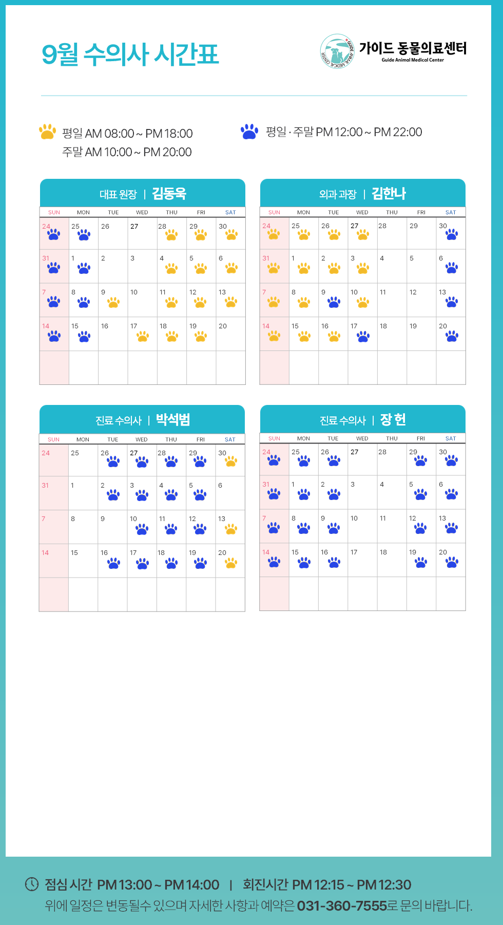 °¡ÀÌµå µ¿¹°ÀÇ·á¼¾ÅÍ2025³â 9¿ù ¼öÀÇ»ç Áø·á ½Ã°£Ç¥ ÀÔ´Ï´Ù.ÀÇ·áÁø º° ±Ù¹« ÀÏÁ¤ÀÌ ´Ù¸£´Ï, ³»¿øÇϽñâ Àü¿¡ Âü°íÇÏ½Ã¸é ´õ ¿øÈ°ÇÑ Áø·á°¡ °¡´ÉÇÕ´Ï´Ù.**º´¿ø »çÁ¤¿¡ µû¶ó ÀÏÁ¤ÀÌ º¯°æµÉ ¼ö ÀÖÀ¸´Ï, ¹Ì¸® ¾çÇØ ºÎŹ ..