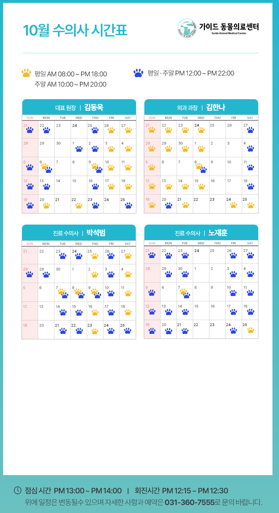 °¡ÀÌµå µ¿¹°ÀÇ·á¼¾ÅÍ2025³â 10¿ù ¼öÀÇ»ç Áø·á ½Ã°£Ç¥ ÀÔ´Ï´Ù.ÀÇ·áÁø º° ±Ù¹« ÀÏÁ¤ÀÌ ´Ù¸£´Ï, ³»¿øÇϽñâ Àü¿¡ Âü°íÇÏ½Ã¸é ´õ ¿øÈ°ÇÑ Áø·á°¡ °¡´ÉÇÕ´Ï´Ù.**º´¿ø »çÁ¤¿¡ µû¶ó ÀÏÁ¤ÀÌ º¯°æµÉ ¼ö ÀÖÀ¸´Ï, ¹Ì¸® ¾çÇØ ºÎŹ..