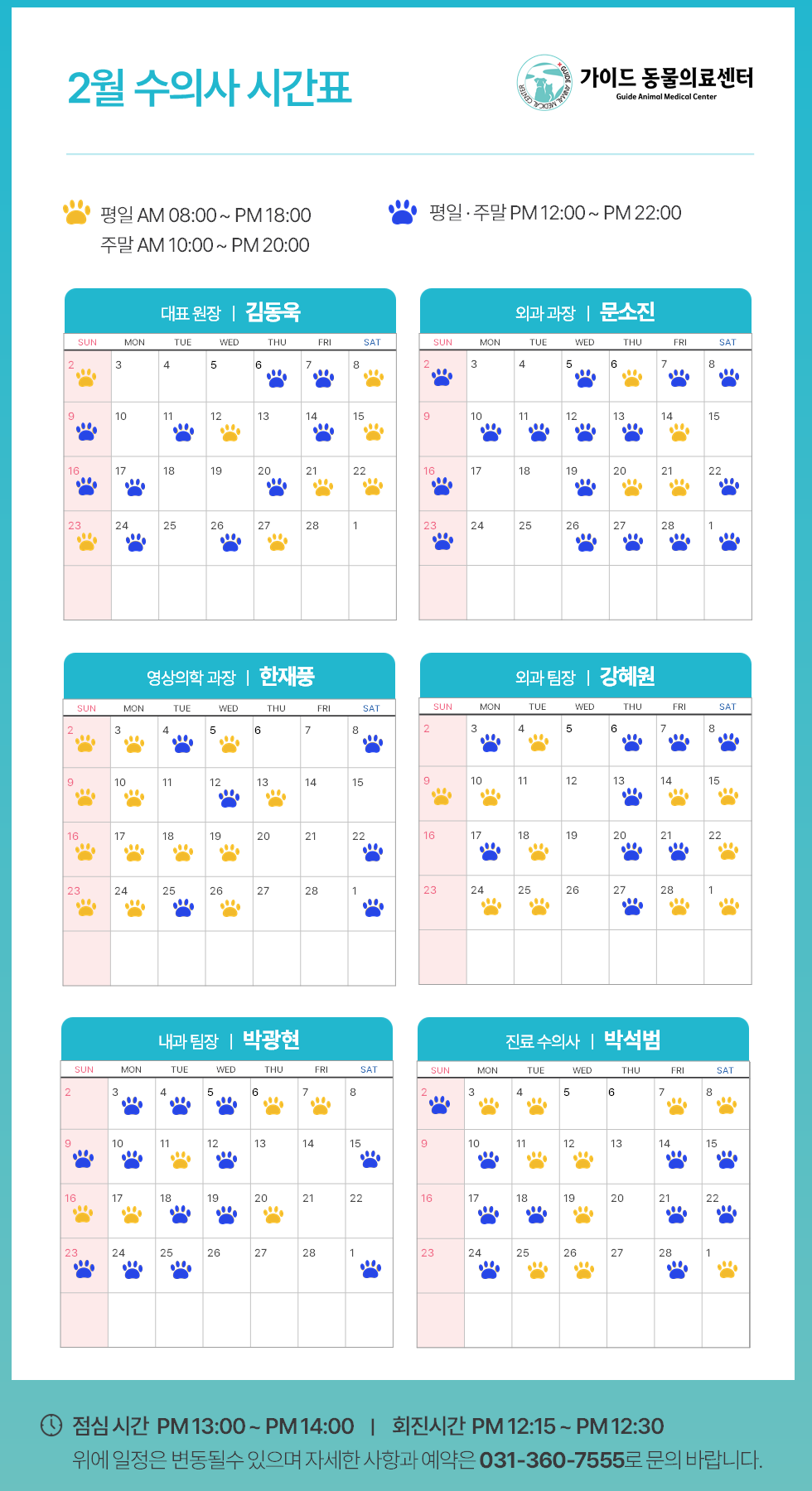 °¡ÀÌµå µ¿¹°ÀÇ·á¼¾ÅÍ2025³â 2¿ù ¼öÀÇ»ç Áø·á ½Ã°£Ç¥ ÀÔ´Ï´Ù.ÀÇ·áÁø º° ±Ù¹« ÀÏÁ¤ÀÌ ´Ù¸£´Ï, ³»¿øÇϽñâ Àü¿¡ Âü°íÇÏ½Ã¸é ´õ ¿øÈ°ÇÑ Áø·á°¡ °¡´ÉÇÕ´Ï´Ù.**º´¿ø »çÁ¤¿¡ µû¶ó ÀÏÁ¤ÀÌ º¯°æµÉ ¼ö ÀÖÀ¸´Ï, ¹Ì¸® ¾çÇØ ºÎŹ ..