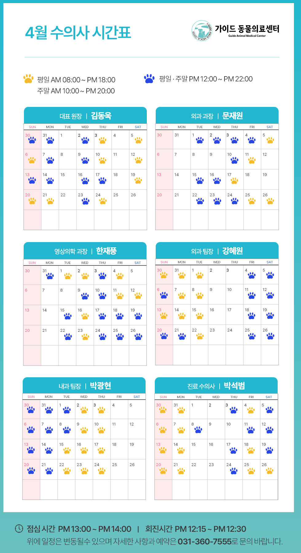 °¡ÀÌµå µ¿¹°ÀÇ·á¼¾ÅÍ2025³â 4¿ù ¼öÀÇ»ç Áø·á ½Ã°£Ç¥ ÀÔ´Ï´Ù.ÀÇ·áÁø º° ±Ù¹« ÀÏÁ¤ÀÌ ´Ù¸£´Ï, ³»¿øÇϽñâ Àü¿¡ Âü°íÇÏ½Ã¸é ´õ ¿øÈ°ÇÑ Áø·á°¡ °¡´ÉÇÕ´Ï´Ù.**º´¿ø »çÁ¤¿¡ µû¶ó ÀÏÁ¤ÀÌ º¯°æµÉ ¼ö ÀÖÀ¸´Ï, ¹Ì¸® ¾çÇØ ºÎŹ ..