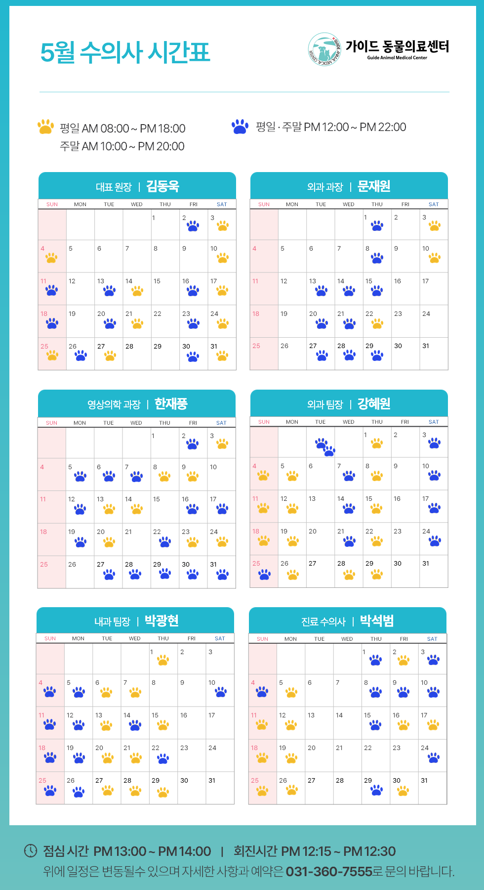 °¡ÀÌµå µ¿¹°ÀÇ·á¼¾ÅÍ2025³â 5¿ù ¼öÀÇ»ç Áø·á ½Ã°£Ç¥ ÀÔ´Ï´Ù.ÀÇ·áÁø º° ±Ù¹« ÀÏÁ¤ÀÌ ´Ù¸£´Ï, ³»¿øÇϽñâ Àü¿¡ Âü°íÇÏ½Ã¸é ´õ ¿øÈ°ÇÑ Áø·á°¡ °¡´ÉÇÕ´Ï´Ù.**º´¿ø »çÁ¤¿¡ µû¶ó ÀÏÁ¤ÀÌ º¯°æµÉ ¼ö ÀÖÀ¸´Ï, ¹Ì¸® ¾çÇØ ºÎŹ ..