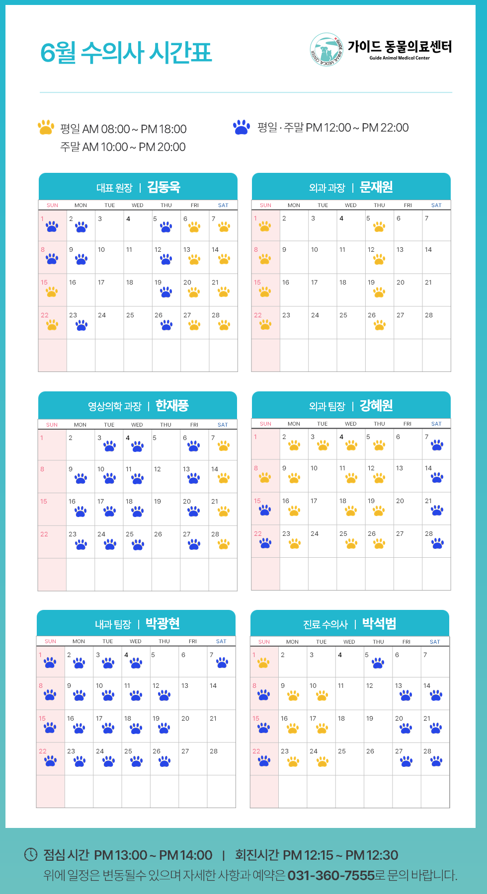 °¡ÀÌµå µ¿¹°ÀÇ·á¼¾ÅÍ2025³â 6¿ù ¼öÀÇ»ç Áø·á ½Ã°£Ç¥ ÀÔ´Ï´Ù.ÀÇ·áÁø º° ±Ù¹« ÀÏÁ¤ÀÌ ´Ù¸£´Ï, ³»¿øÇϽñâ Àü¿¡ Âü°íÇÏ½Ã¸é ´õ ¿øÈ°ÇÑ Áø·á°¡ °¡´ÉÇÕ´Ï´Ù.**º´¿ø »çÁ¤¿¡ µû¶ó ÀÏÁ¤ÀÌ º¯°æµÉ ¼ö ÀÖÀ¸´Ï, ¹Ì¸® ¾çÇØ ºÎŹ ..