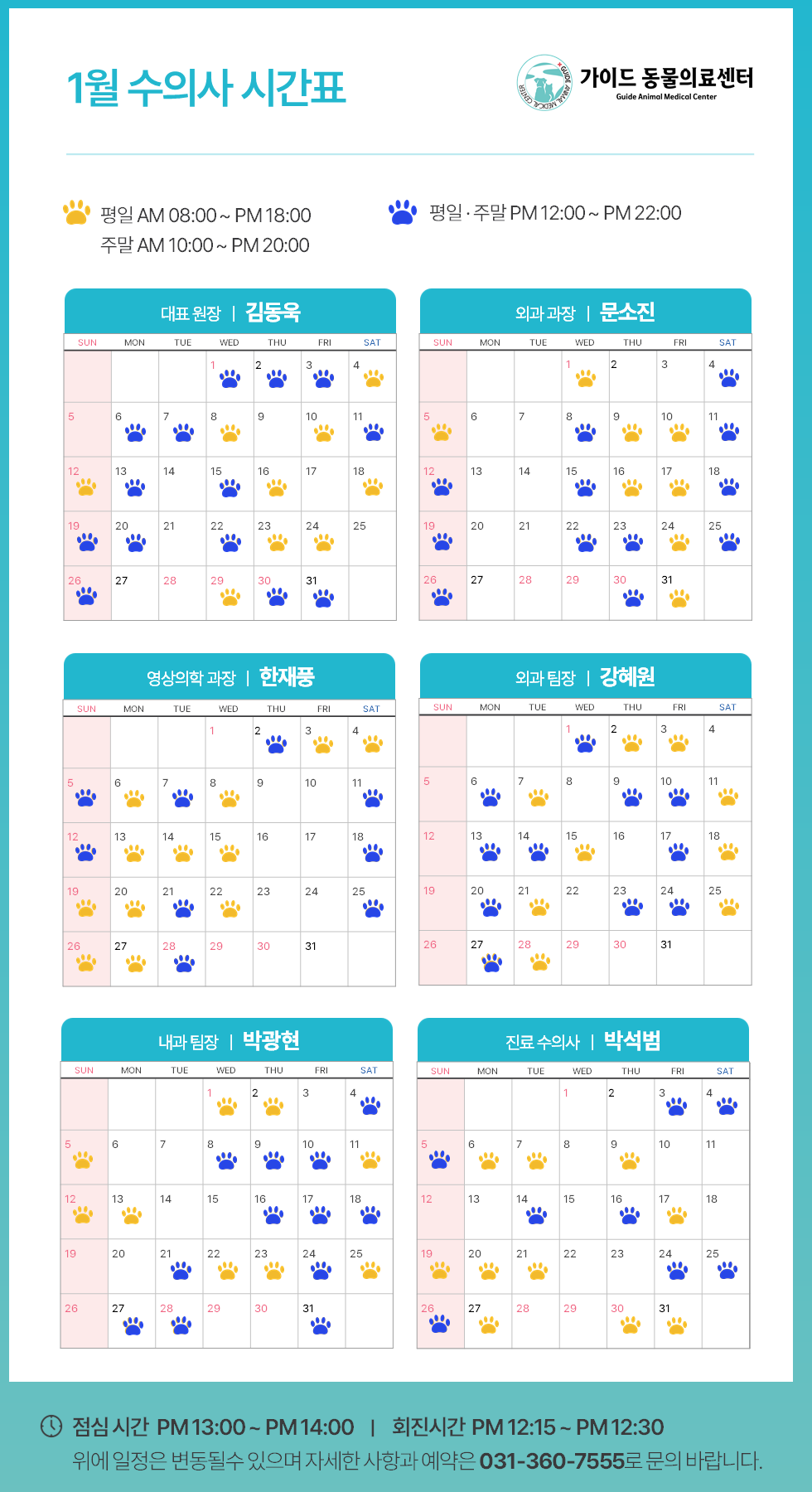°¡ÀÌµå µ¿¹°ÀÇ·á¼¾ÅÍ2025³â 1¿ù ¼öÀÇ»ç Áø·á ½Ã°£Ç¥ ÀÔ´Ï´Ù.ÀÇ·áÁø º° ±Ù¹« ÀÏÁ¤ÀÌ ´Ù¸£´Ï, ³»¿øÇϽñâ Àü¿¡ Âü°íÇÏ½Ã¸é ´õ ¿øÈ°ÇÑ Áø·á°¡ °¡´ÉÇÕ´Ï´Ù.**º´¿ø »çÁ¤¿¡ µû¶ó ÀÏÁ¤ÀÌ º¯°æµÉ ¼ö ÀÖÀ¸´Ï, ¹Ì¸® ¾çÇØ ºÎŹ ..