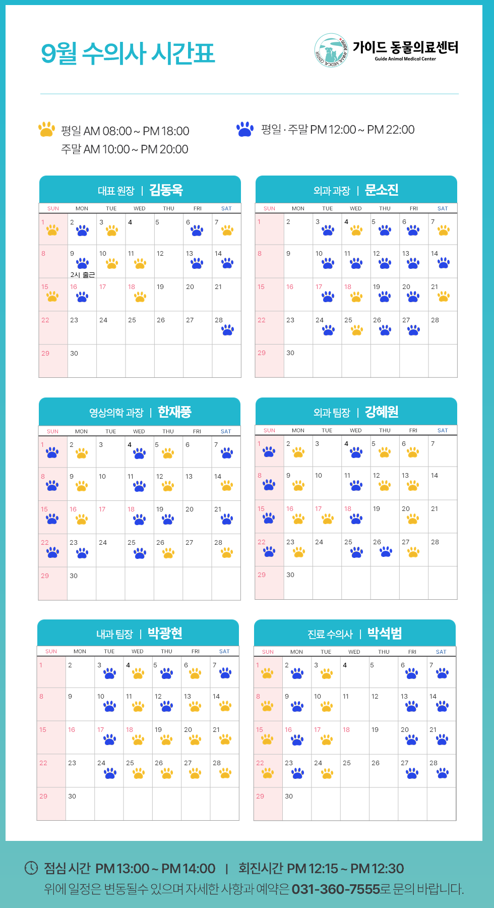 °¡ÀÌµå µ¿¹°ÀÇ·á¼¾ÅÍ2024³â 9¿ù ¼öÀÇ»ç Áø·á ½Ã°£Ç¥ ÀÔ´Ï´Ù.ÀÇ·áÁø º° ±Ù¹«ÀÏÁ¤ÀÌ ´Ù¸£´Ï, ³»¿øÇϽñâ Àü¿¡ Âü°íÇÏ½Ã¸é ´õ ¿øÈ°ÇÑ Áø·á°¡ °¡´ÉÇÕ´Ï´Ù.**º´¿ø »çÁ¤¿¡ µû¶ó ÀÏÁ¤ÀÌ º¯°æµÉ ¼ö ÀÖÀ¸´Ï, ¹Ì¸® ¾çÇØ ºÎʵå..