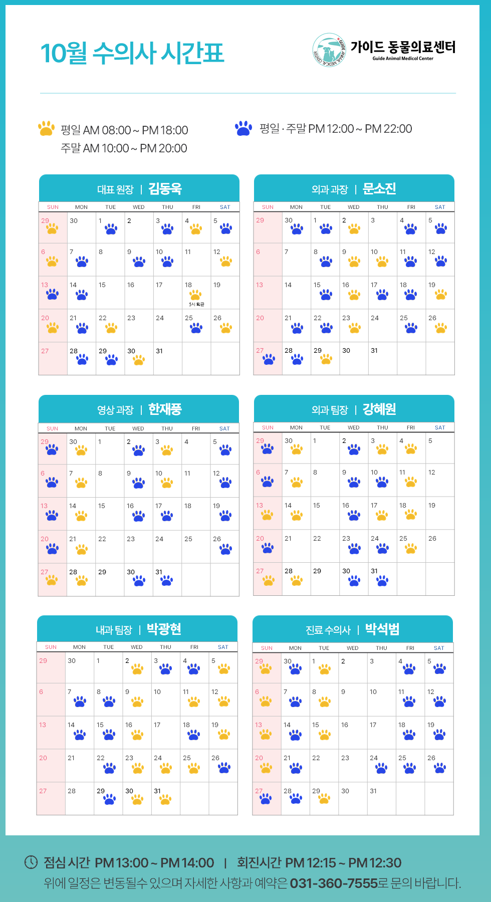 °¡ÀÌµå µ¿¹°ÀÇ·á¼¾ÅÍ2024³â 10¿ù ¼öÀÇ»ç Áø·á ½Ã°£Ç¥ ÀÔ´Ï´Ù.ÀÇ·áÁø º° ±Ù¹«ÀÏÁ¤ÀÌ ´Ù¸£´Ï, ³»¿øÇϽñâ Àü¿¡ Âü°íÇÏ½Ã¸é ´õ ¿øÈ°ÇÑ Áø·á°¡ °¡´ÉÇÕ´Ï´Ù.**º´¿ø »çÁ¤¿¡ µû¶ó ÀÏÁ¤ÀÌ º¯°æµÉ ¼ö ÀÖÀ¸´Ï, ¹Ì¸® ¾çÇØ ºÎŹ..