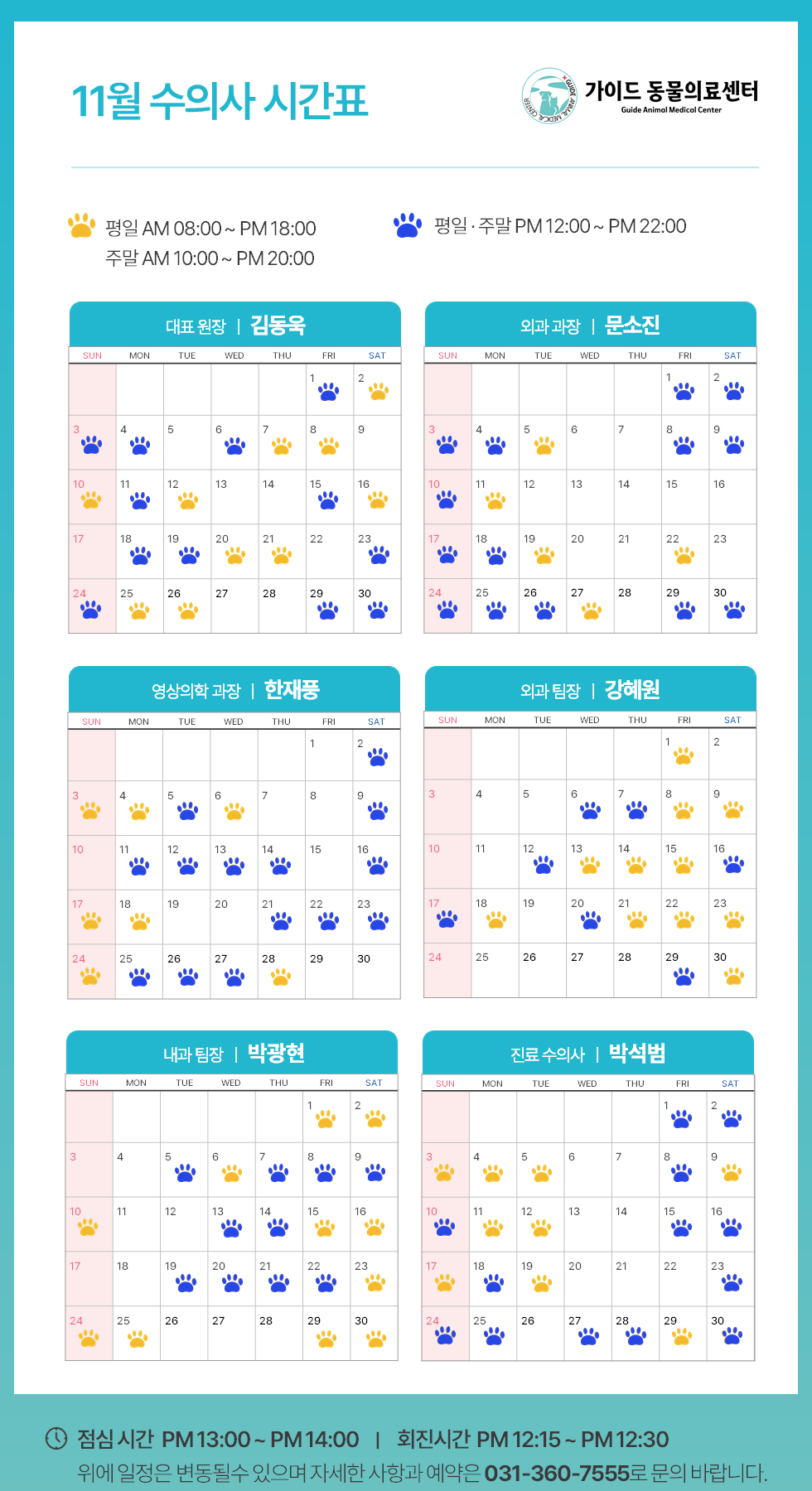 °¡ÀÌµå µ¿¹°ÀÇ·á¼¾ÅÍ2024³â 11¿ù ¼öÀÇ»ç Áø·á ½Ã°£Ç¥ ÀÔ´Ï´Ù.ÀÇ·áÁø º° ±Ù¹« ÀÏÁ¤ÀÌ ´Ù¸£´Ï, ³»¿øÇϽñâ Àü¿¡ Âü°íÇÏ½Ã¸é ´õ ¿øÈ°ÇÑ Áø·á°¡ °¡´ÉÇÕ´Ï´Ù.**º´¿ø »çÁ¤¿¡ µû¶ó ÀÏÁ¤ÀÌ º¯°æµÉ ¼ö ÀÖÀ¸´Ï, ¹Ì¸® ¾çÇØ ºÎŹ..