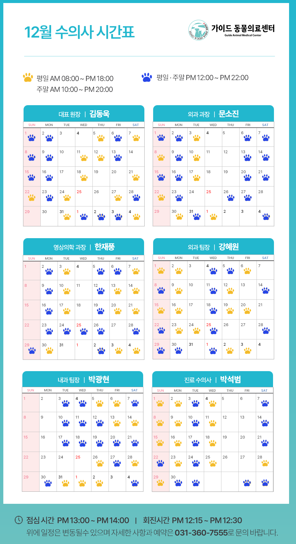 °¡ÀÌµå µ¿¹°ÀÇ·á¼¾ÅÍ2024³â 12¿ù ¼öÀÇ»ç Áø·á ½Ã°£Ç¥ ÀÔ´Ï´Ù.ÀÇ·áÁø º° ±Ù¹« ÀÏÁ¤ÀÌ ´Ù¸£´Ï, ³»¿øÇϽñâ Àü¿¡ Âü°íÇÏ½Ã¸é ´õ ¿øÈ°ÇÑ Áø·á°¡ °¡´ÉÇÕ´Ï´Ù.**º´¿ø »çÁ¤¿¡ µû¶ó ÀÏÁ¤ÀÌ º¯°æµÉ ¼ö ÀÖÀ¸´Ï, ¹Ì¸® ¾çÇØ ºÎŹ..