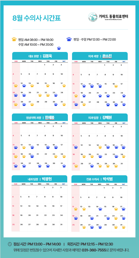 °¡ÀÌµå µ¿¹°ÀÇ·á¼¾ÅÍ2024³â 8¿ù ¼öÀÇ»ç Áø·á ½Ã°£Ç¥ ÀÔ´Ï´Ù.ÀÇ·áÁø º° ±Ù¹«ÀÏÁ¤ÀÌ ´Ù¸£´Ï, ³»¿øÇϽñâ Àü¿¡ Âü°íÇÏ½Ã¸é ´õ ¿øÈ°ÇÑ Áø·á°¡ °¡´ÉÇÕ´Ï´Ù.**º´¿ø »çÁ¤¿¡ µû¶ó ÀÏÁ¤ÀÌ º¯°æµÉ ¼ö ÀÖÀ¸´Ï, ¹Ì¸® ¾çÇØ ºÎʵå..